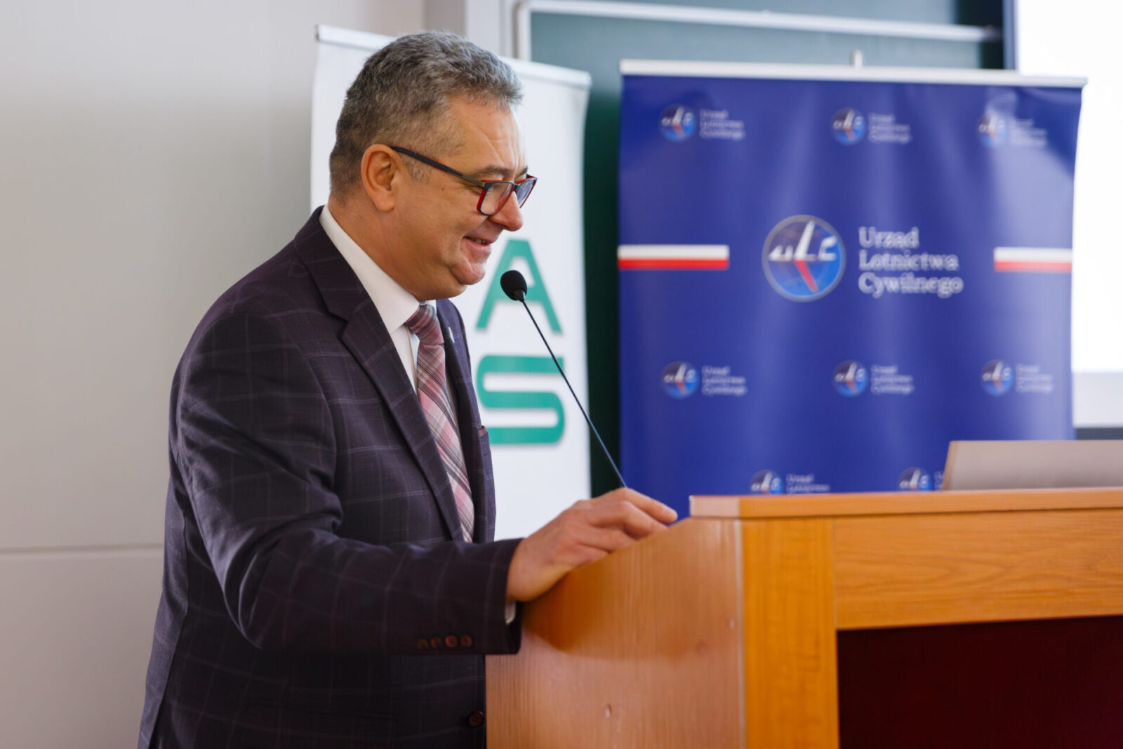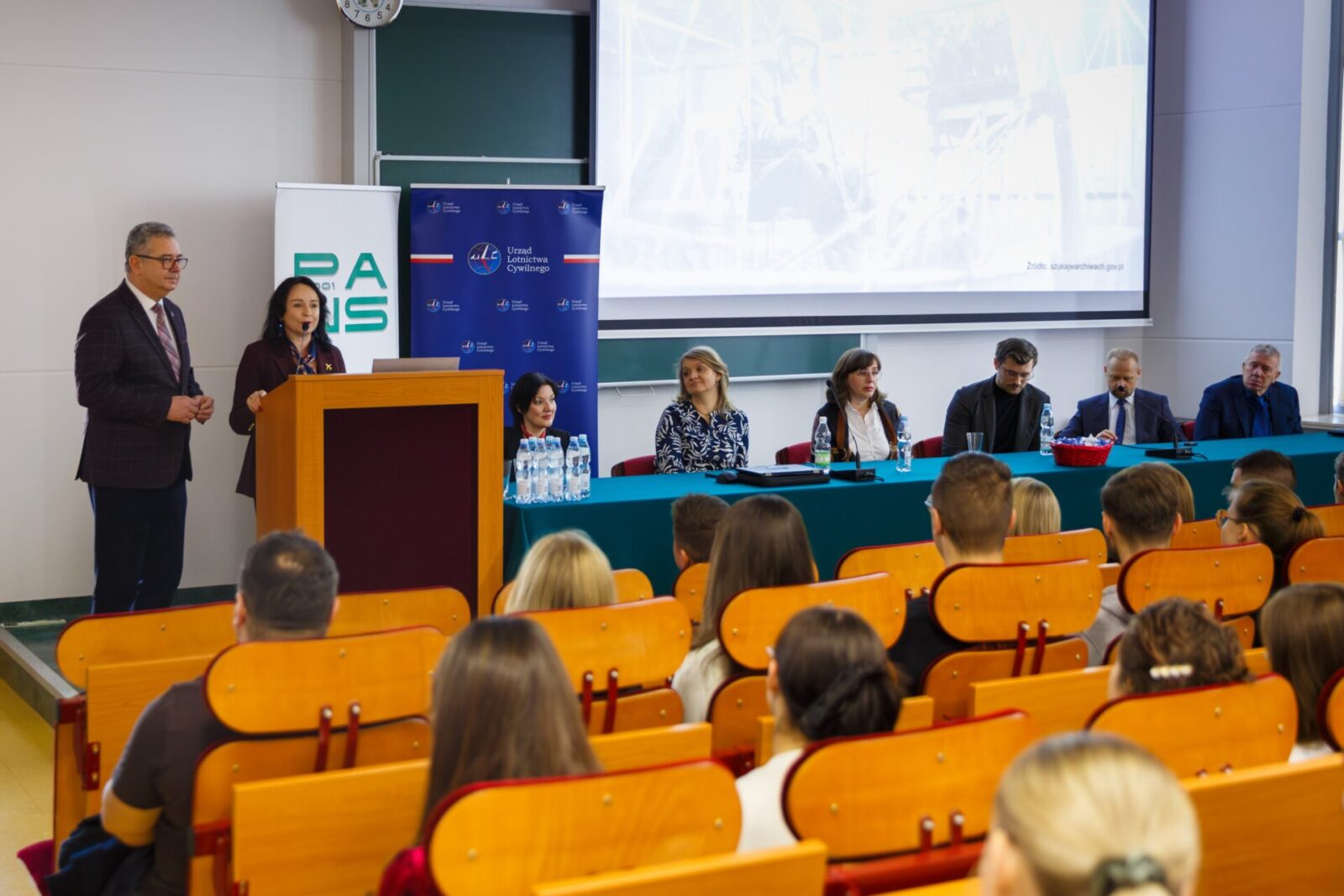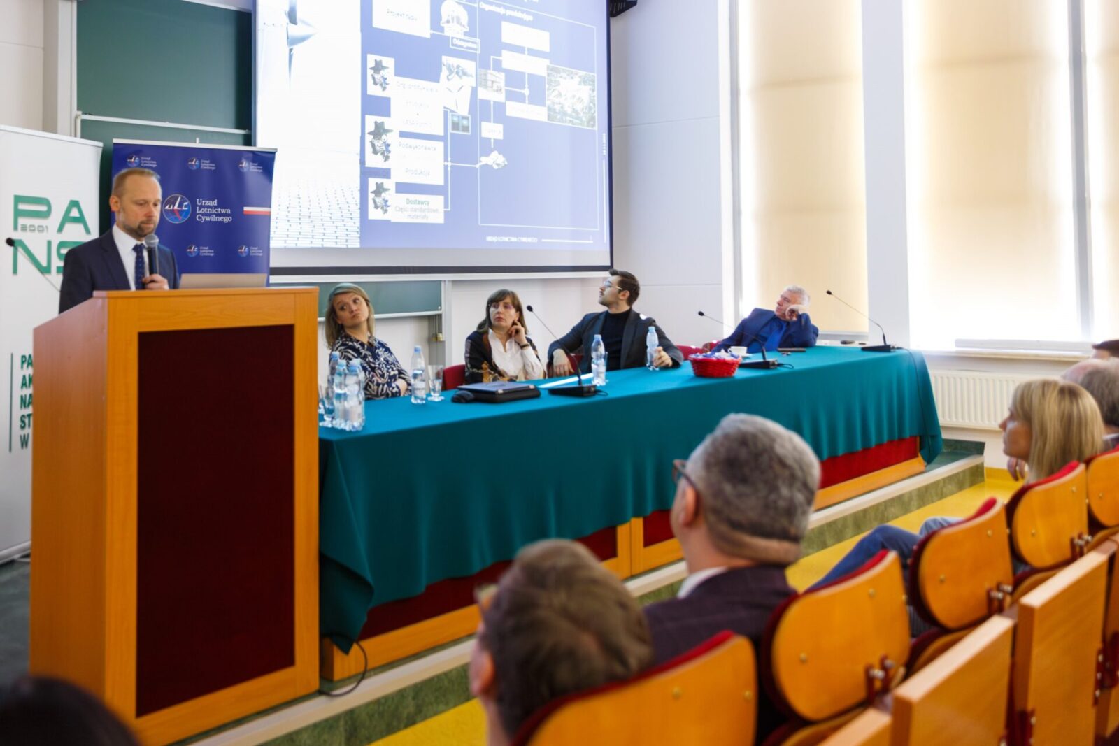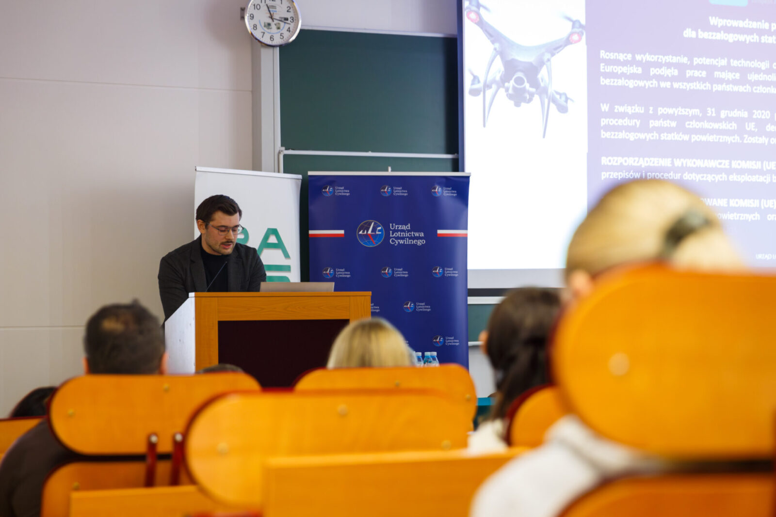 Pani Anna Jankowska przybliżyła zagadnienia związane z ochroną lotnictwa cywilnego, a Pan Karol Kądziela mówił o rosnącym znaczeniu dronów i wyzwaniach wynikających z rozwoju technologii bezzałogowych statków powietrznych.