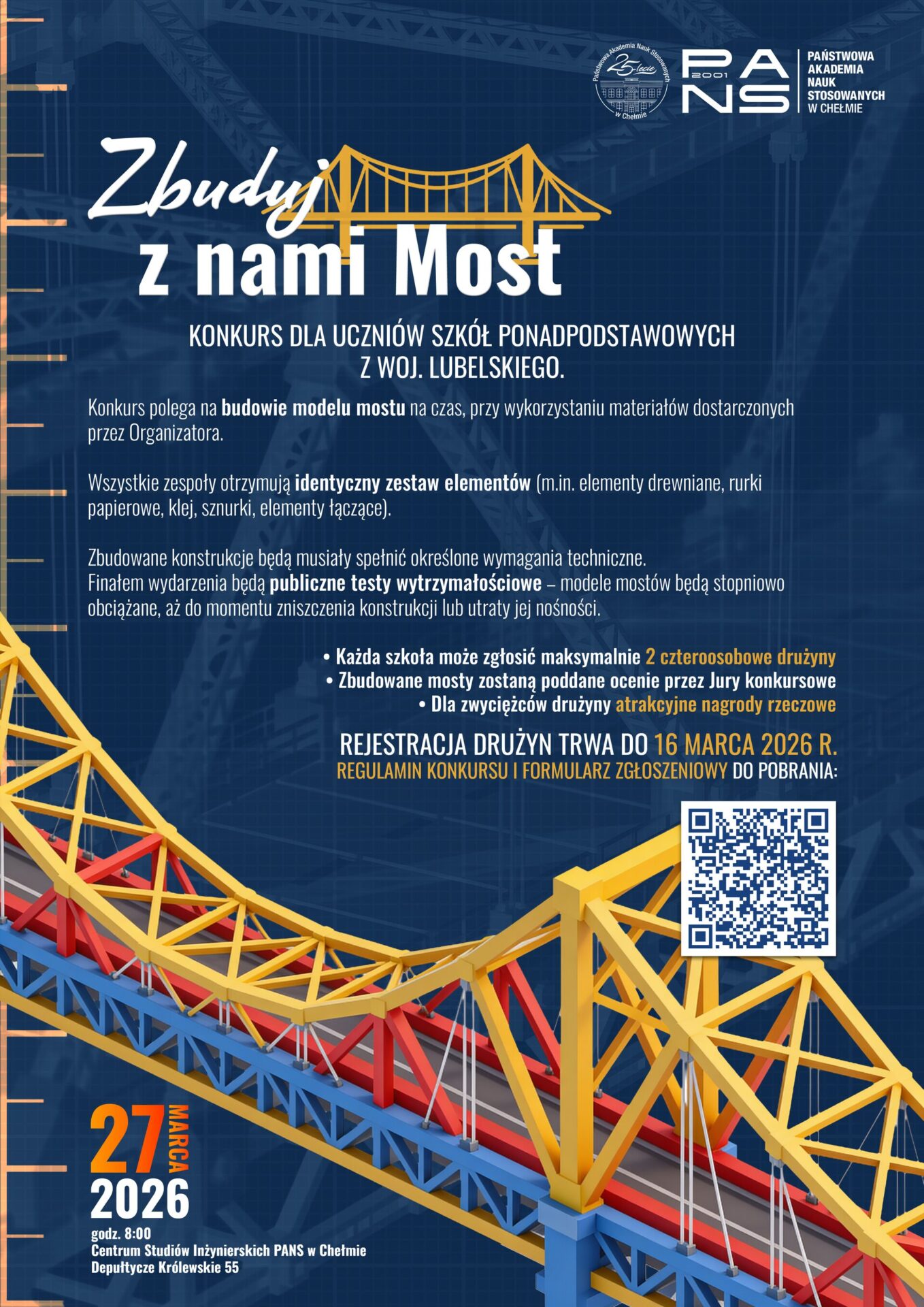 Z okazji obchodzonego 4 marca Światowego Dnia Inżyniera, Katedra Budownictwa Państwowej Akademii Nauk Stosowanych w Chełmie zaprasza uczniów szkół ponadpodstawowych z województwa lubelskiego do udziału w wyjątkowym konkursie konstrukcyjnym – „Zbuduj z nami Most”.