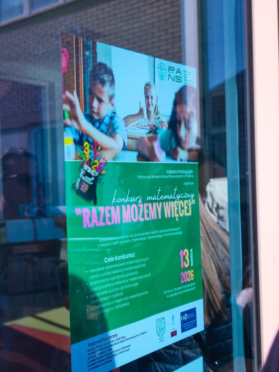 13 marca 2026 r. w Centrum Studiów Inżynierskich w Depułtyczach Królewskich odbył się konkurs matematyczny „Razem możemy więcej”, zorganizowany przez katedrę Pedagogiki Państwowej Akademii Nauk Stosowanych w Chełmie. Wydarzenie objęte zostało patronatem JM Rektor Państwowej Akademii Nauk Stosowanych w Chełmie prof. ucz. dr Beaty Fałdy, Senatora RP prof. ucz. dr hab. Józefa Zająca, Lubelskiego Kuratora Oświaty Tomasza Szabłowskiego oraz Dyrektora Instytutu Matematyki i Informatyki dra Jarosława Kapelusznego.