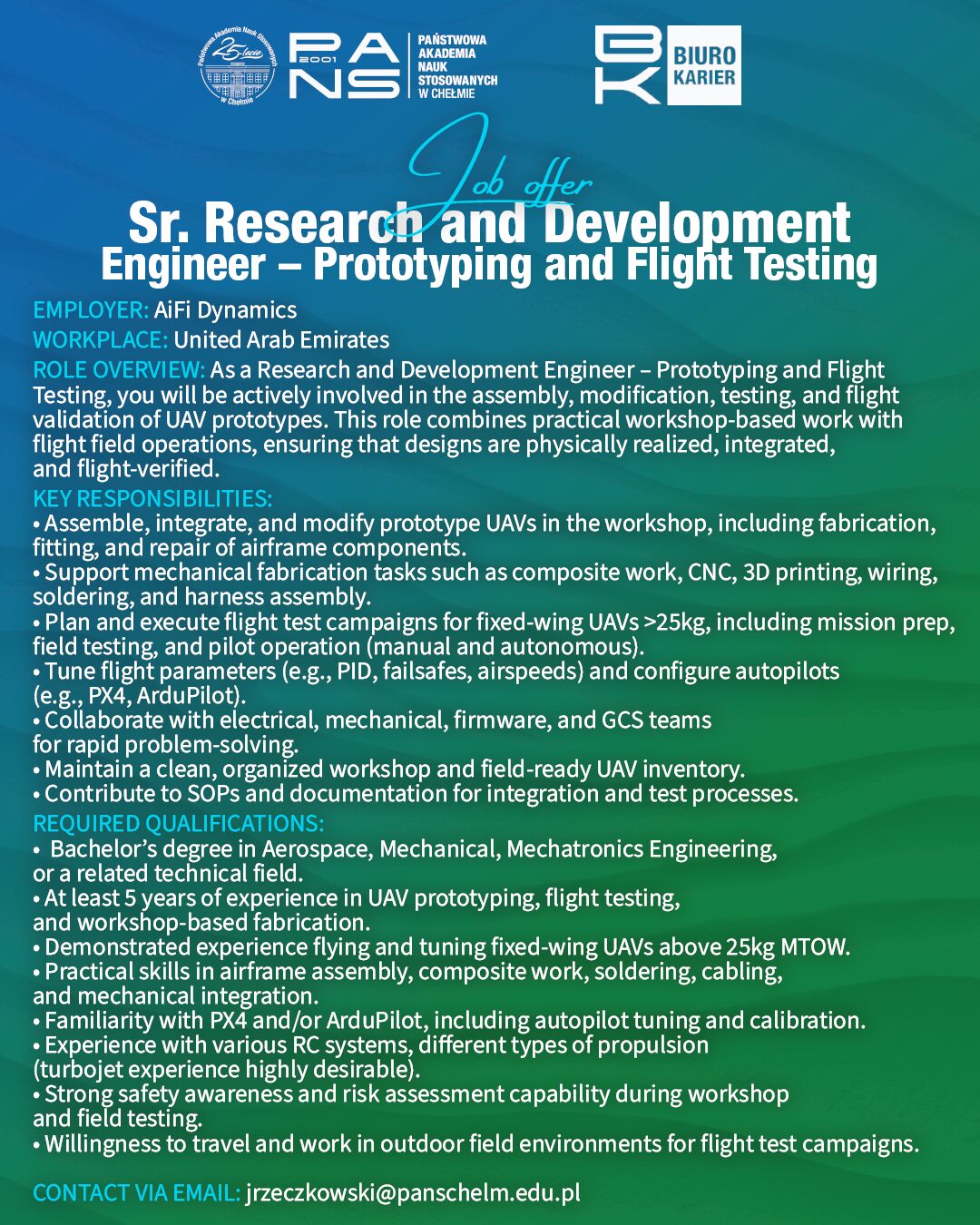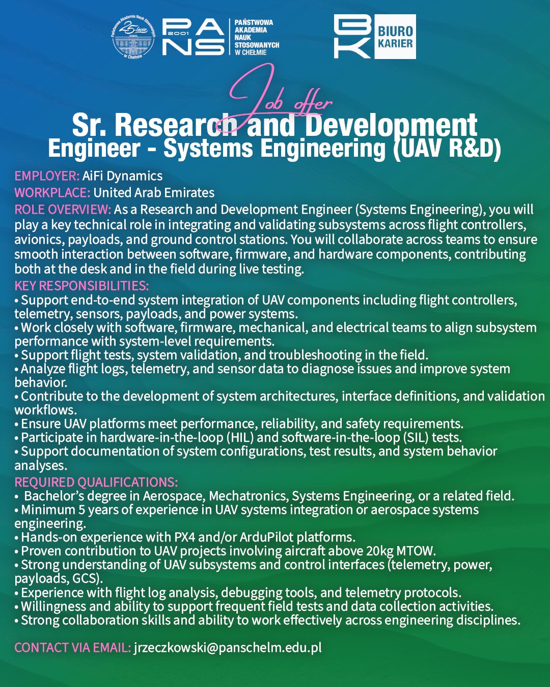 Oczekiwane jest wykształcenie techniczne oraz doświadczenie w pracy przy projektach lotniczych lub systemach bezzałogowych.