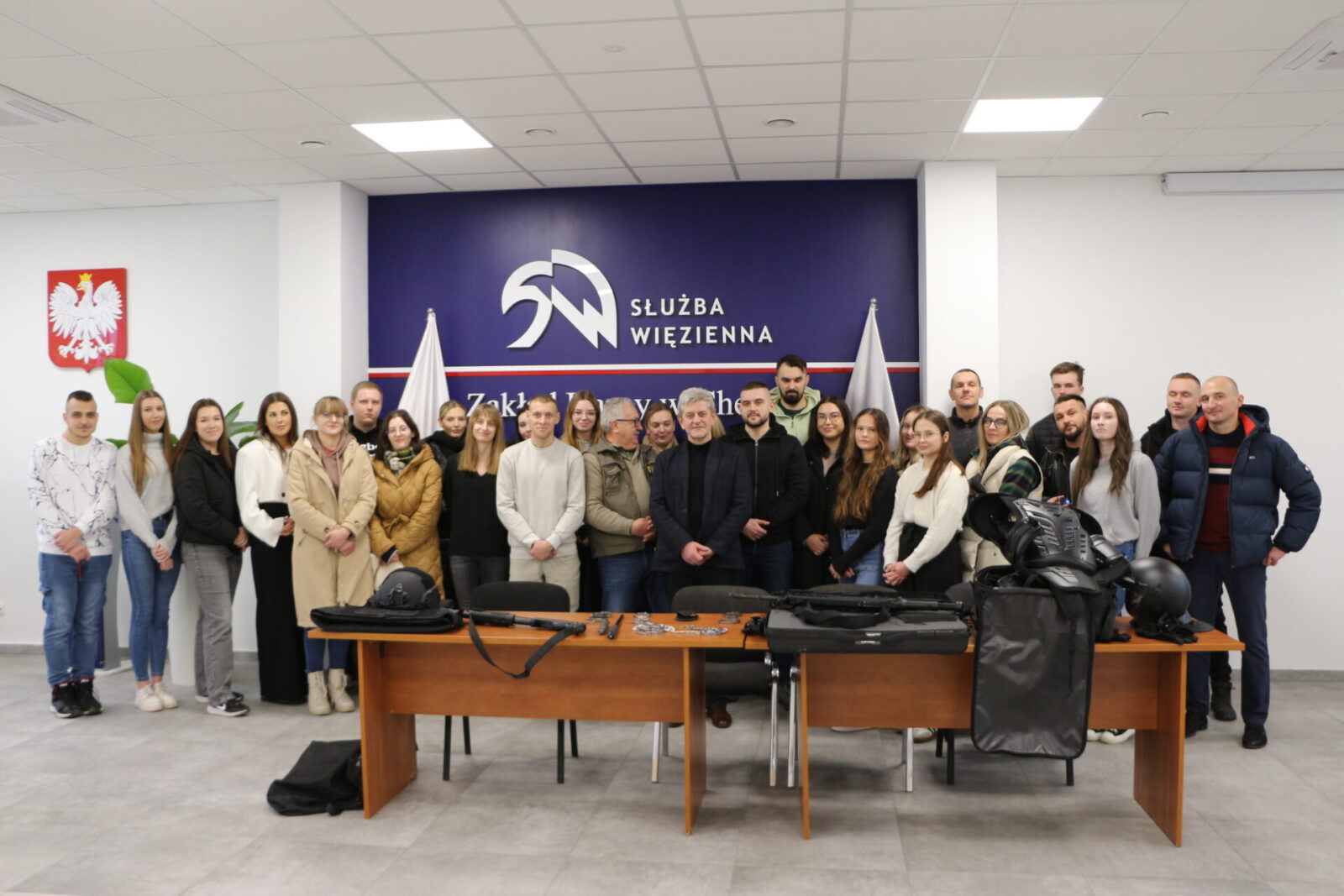 Kolejnym etapem była wizyta w wybranych obiektach zakładu karnego. Uczestnicy mieli możliwość zobaczenia m.in. cel mieszkalnych, spacernika dla osadzonych, kaplicy ekumenicznej oraz celi zabezpieczającej – środka przymusu bezpośredniego charakterystycznego dla Służby Więziennej. Zwiedzanie pozwoliło studentom lepiej zrozumieć warunki odbywania kary pozbawienia wolności oraz zasady zapewniania bezpieczeństwa i porządku na terenie jednostki penitencjarnej.
