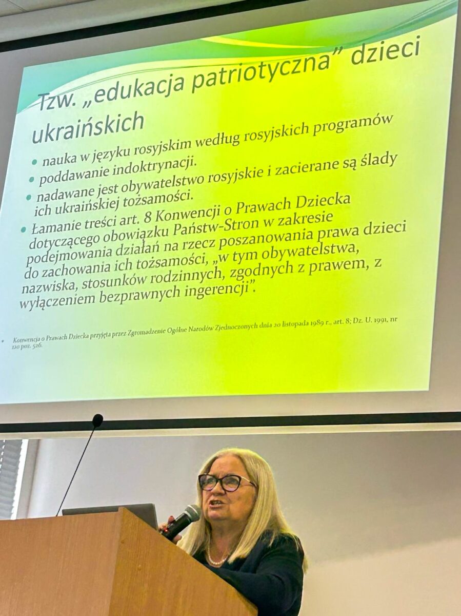 Podczas wystąpienia prelegentka omówiła najważniejsze zagadnienia dotyczące sytuacji dzieci osieroconych w wyniku działań wojennych, zwracając szczególną uwagę na aspekty społeczne, prawne i edukacyjne. W trakcie wykładu poruszono m.in. następujące kwestie: